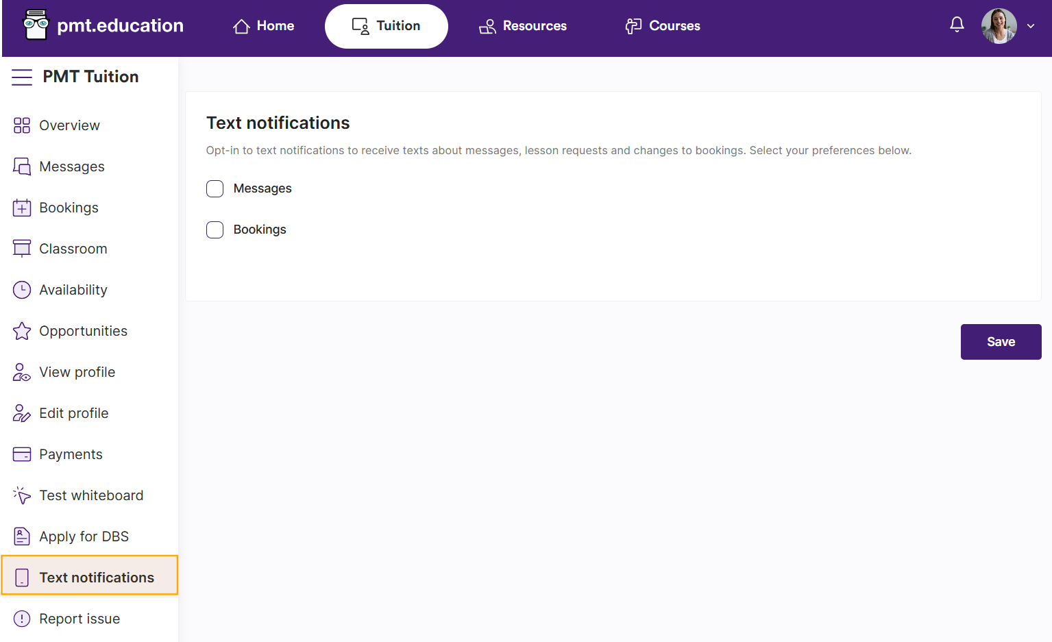 Tutors can now opt-in to receive text notifications, meaning you can be notified when a client messages you or if there's any changes to your bookings. Please note this feature is currently available for tutors only.