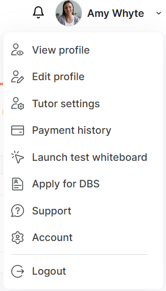 From the drop-down menu at the top right of your tutor account, you will find your notification section to the left, and 8 sections below: