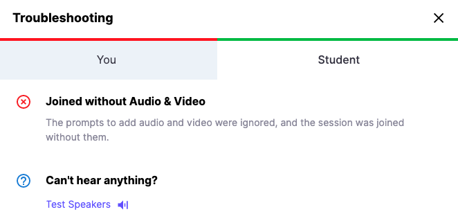 Lessonspace has a built-in Troubleshooting menu that highlights connectivity, audio and device issues during your lesson.