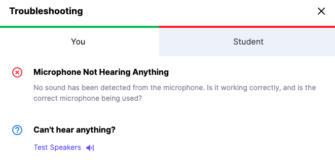 Lessonspace has a built-in Troubleshooting menu that highlights connectivity, audio and device issues during your lesson.
