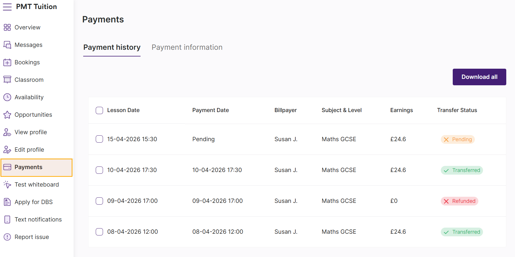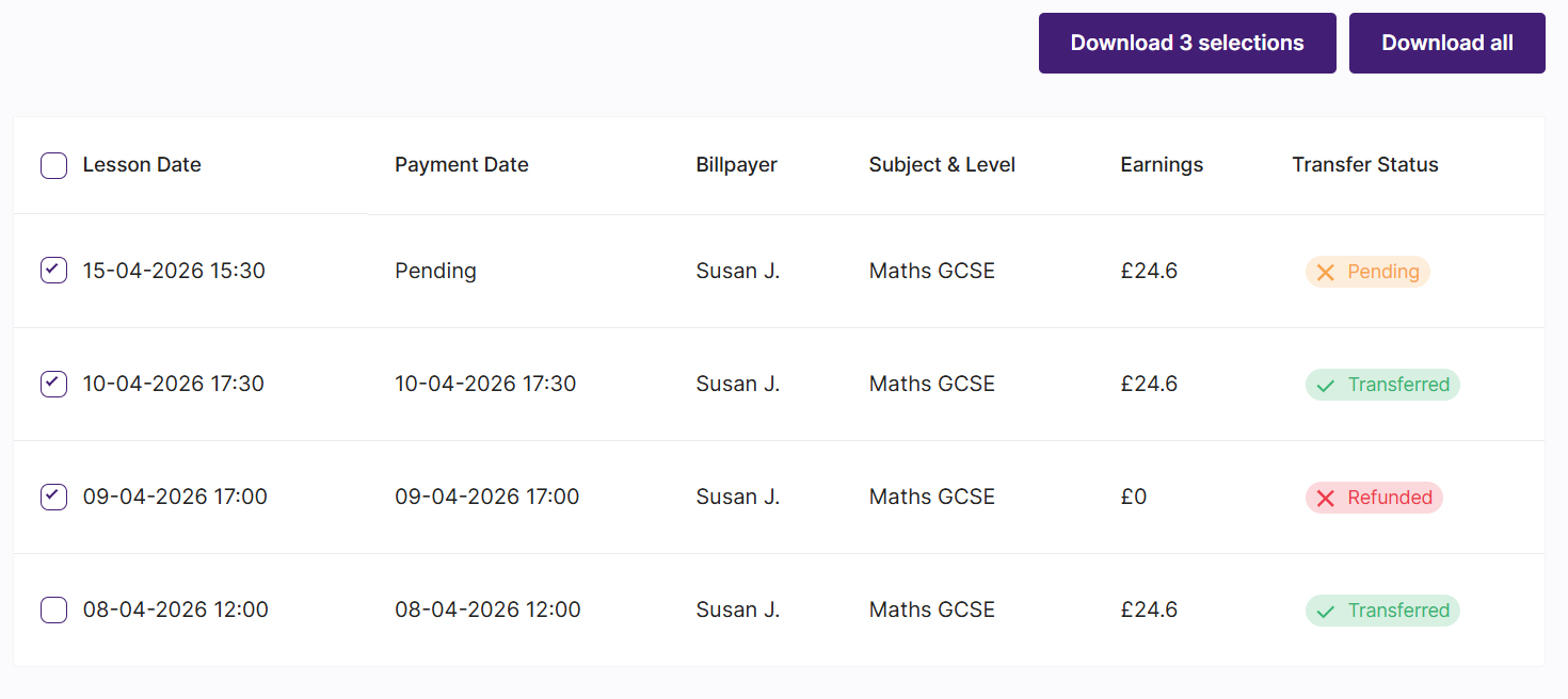 Here, you’ll find all of your previous and pending payments for lessons that have taken place or been refunded.