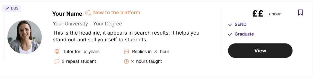 See the example profile below to get a clear idea of how your information will appear on the tutor search page: