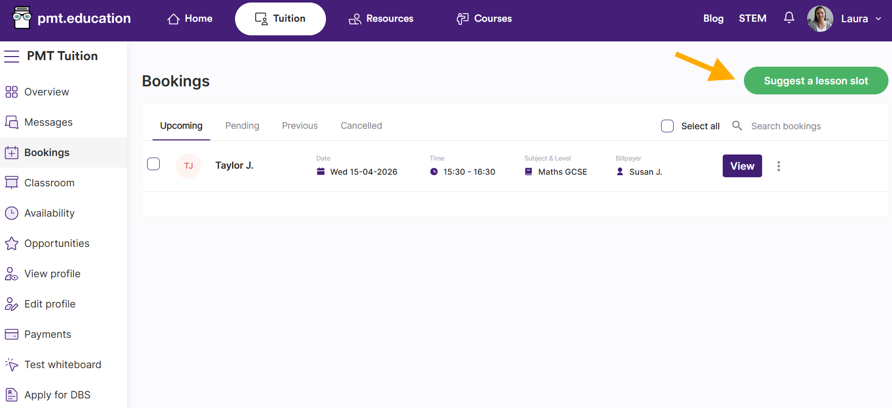 In both cases, all booking activity can be tracked in the Bookings section of your tuition dashboard.