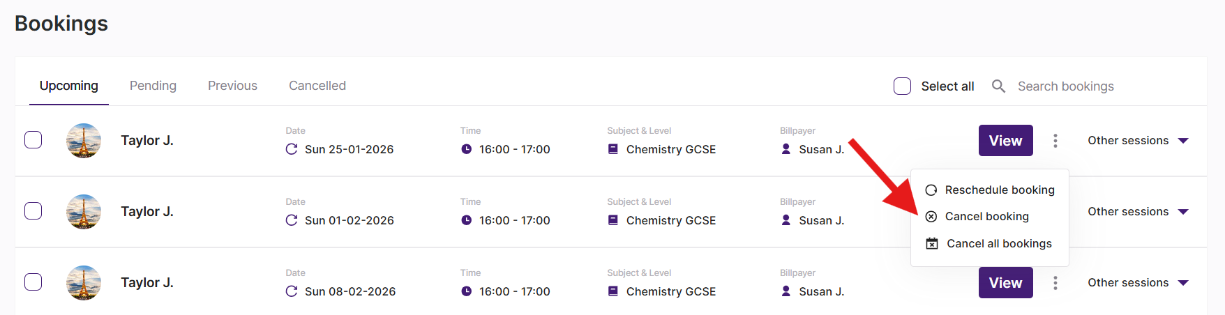 Go to the Upcoming tab in your Bookings, click the three dots next to the lesson, and select either: