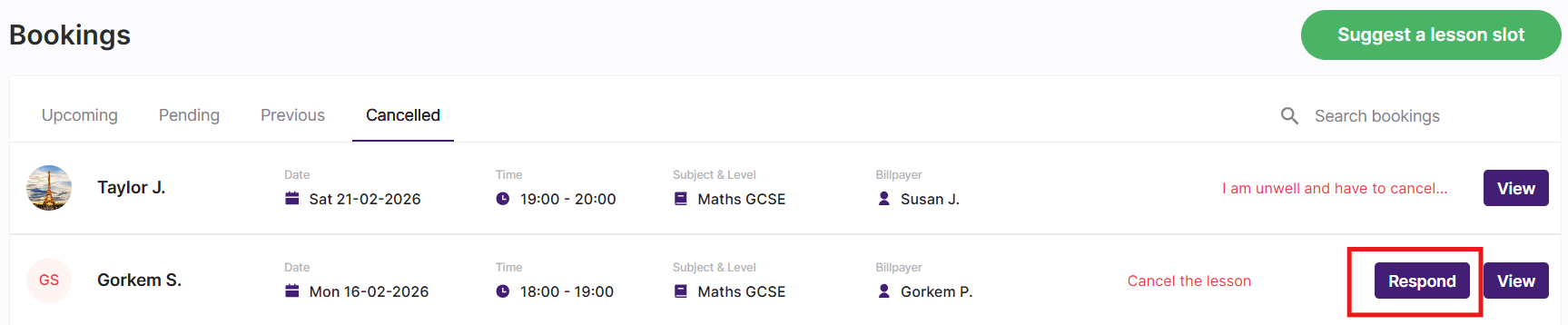 To choose how much to charge, click the ‘Respond’ button next to the relevant cancelled lesson: