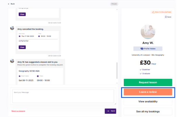 You can also leave a review directly from your tutor chat by clicking the Leave a review button on the right, which takes you to the same review form.After you’ve had more lessons together, you’ll have the option to leave another, final review. When your tutor requests a review, you’ll also receive an email invitation prompting you to leave your feedback.
