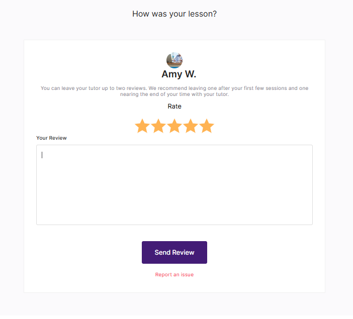 After your first lesson, you’ll be invited to leave an initial review. It’s often best to wait until you’ve had a few lessons so your feedback reflects your experience more accurately.