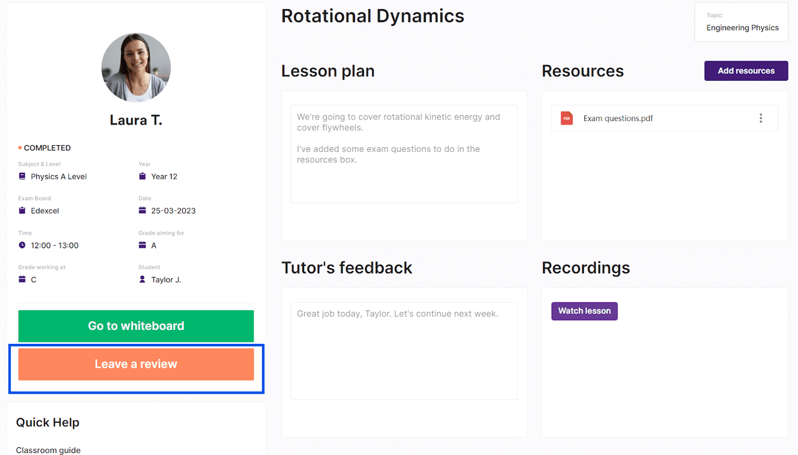 A tutor’s feedback appears on their public profile, fully visible to other students and billpayers. Many people will use these reviews to make an informed decision about whether or not to book a prospective tutor, while a tutor can use them to identify areas of improvement. Therefore, it’s really important that what you write is honest, fair, and constructive.