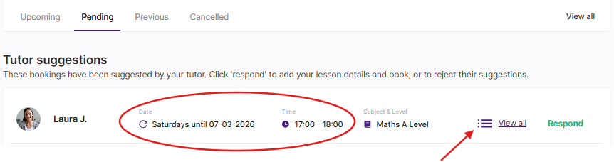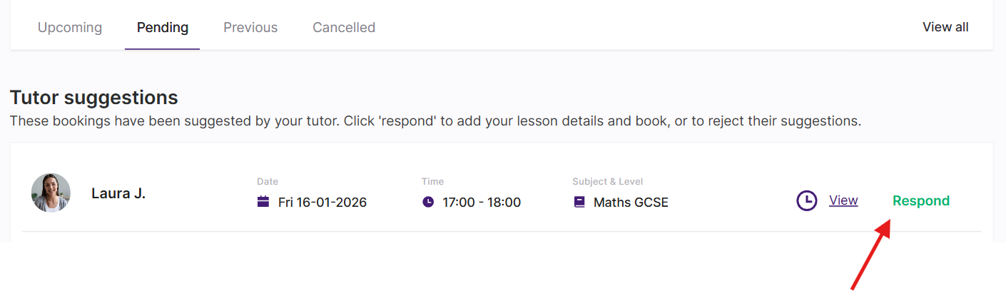 When your tutor sends a lesson suggestion, it will appear in the Pending tab of your Bookings, under Tutor suggestions.
