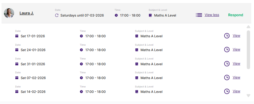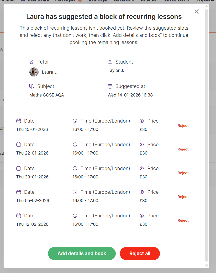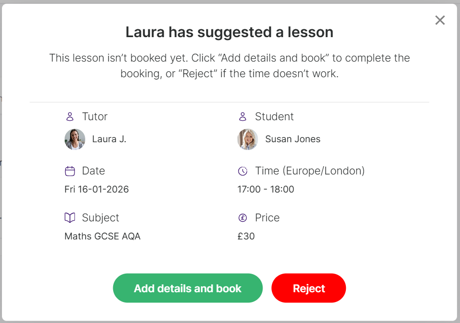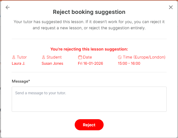A lesson suggestion allows your tutor to propose lesson slots based on their availability. These suggestions can be for: