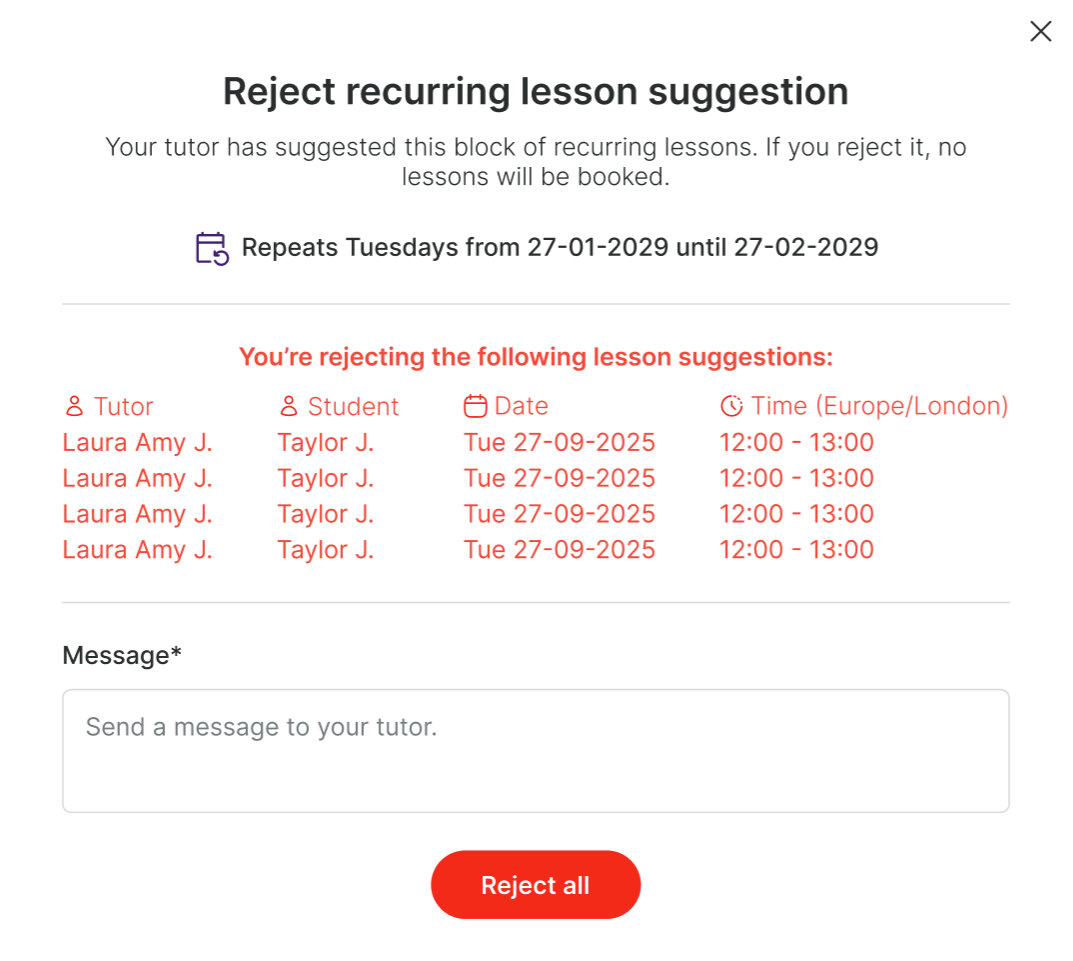 If you can’t do the block of recurring lessons, click Respond on the lesson suggestion and then select Reject all.