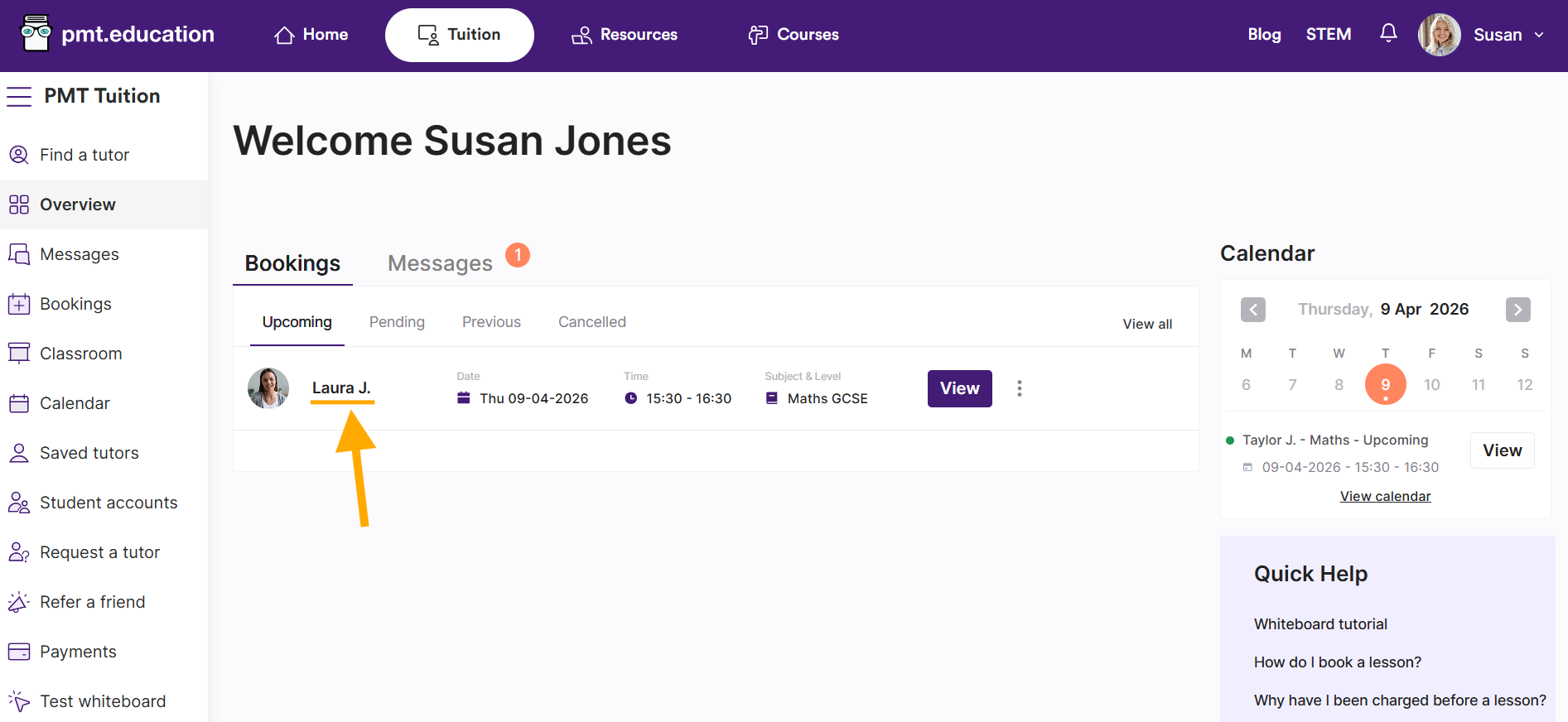 To access your saved booking details, you need to head to your lessons overview with your tutor by clicking on their name anywhere in your dashboard.