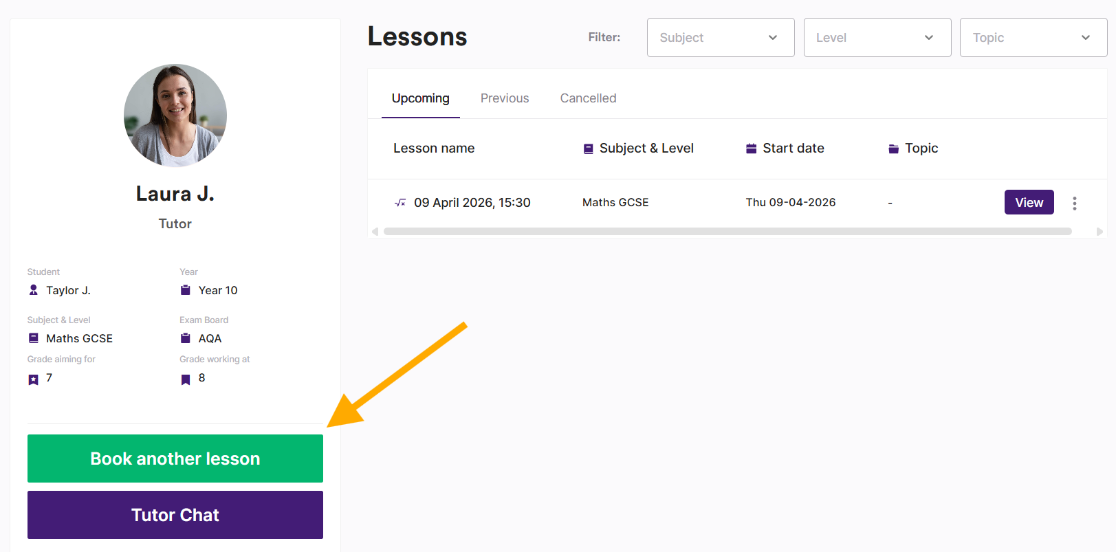 This means the subject, level, exam board, year and your working at / aiming for grades will be autofilled when you next book a lesson, along with your payment details. If you have previously booked a lesson for a student, that information will be saved too.
