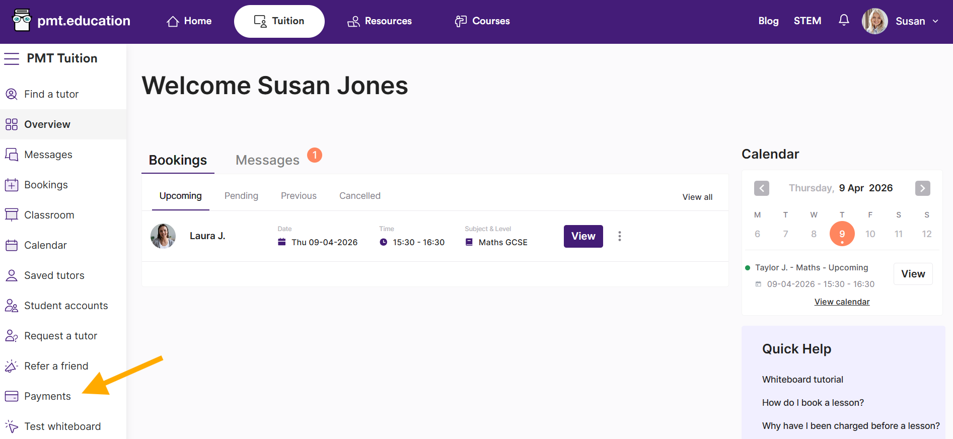 To change the card you’ve booked your lessons with, head to Payments in your navigation:
